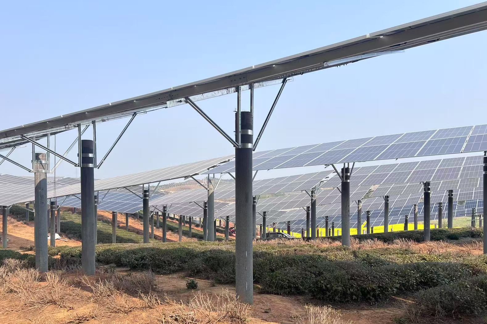 春山谷雨前,并手摘芳烟。远在安徽的一个山岗上,一排排整齐的光伏板在青翠茶树间拔节伫立,与茶园交相辉映、相辅相成。作为北投能源公司首个跨区域重点施工项目,安徽省东至县龙泉镇让塘光伏发电项目(以下简称“让塘光伏项目”)的工程建设在近日取得了较好进展。北投能源公司项目团队以实现一季度“开门红”为目标,坚持“生态优先、绿色施工”理念,确保茶园零污染、茶农零投诉,打造出“项目建设与茶园共生共荣”的标杆范例,为全年高质量发展注入盎然春意。